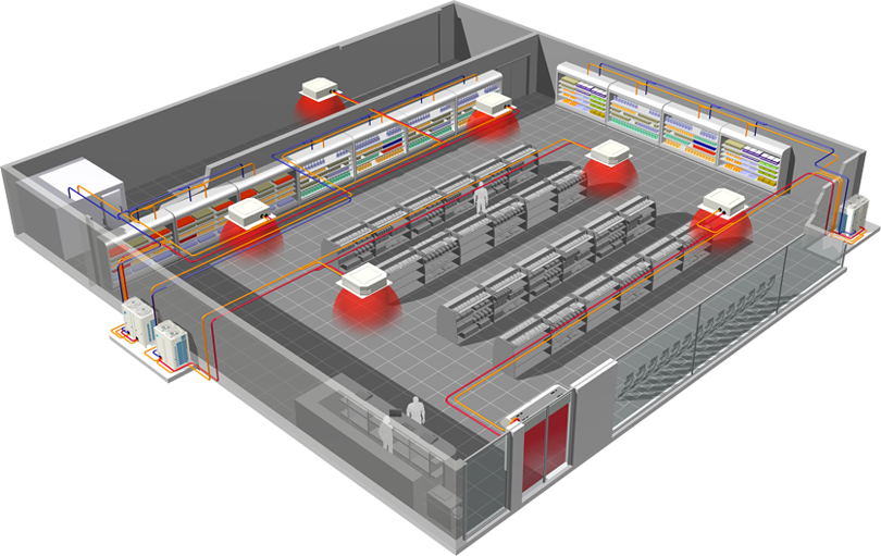 Conveni-pack’s modular design means it can be used in smaller as well as larger stores. The system can be connected to all store cooling applications and has a wide range of indoor air conditioning units to meet your requirements. One or more outdoor units can be installed throughout the building, inside or outside.