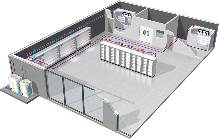 The Conveni-pack offers a flexible solution for medium and low temperature cooling, with integrated air conditioning (cooling and heating) and heat recovery. Conveni-pack recovers up to 100% of the heat emitted from supermarket refrigerators and reuses it to heat the store at no additional cost, improving the environment inside the store.
